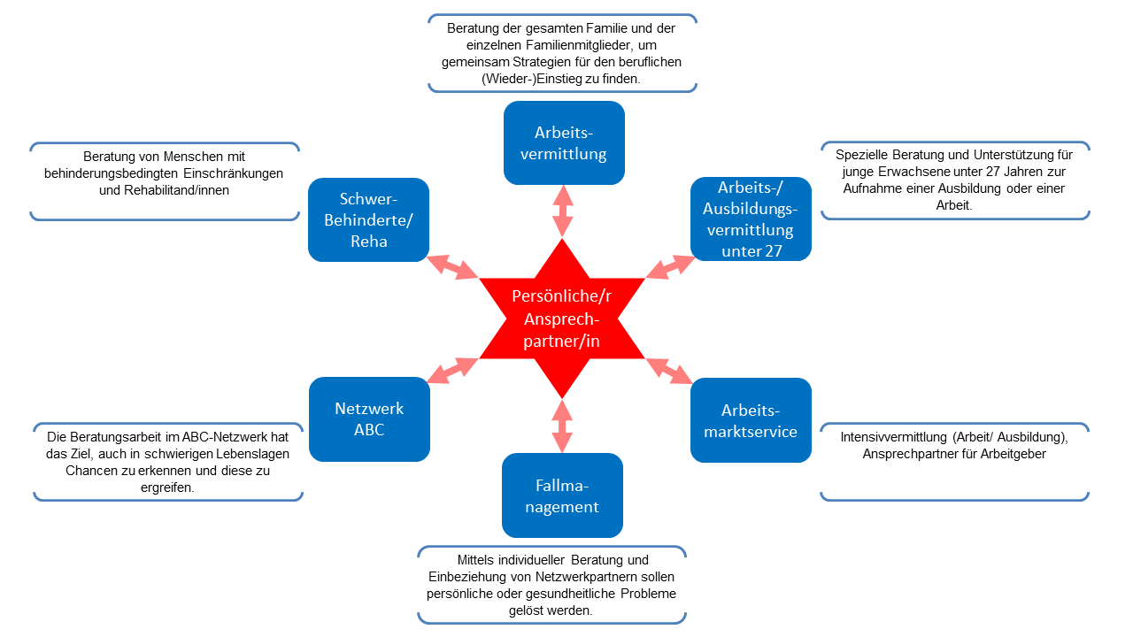 • Ein/e persönliche/r Ansprechpartner/in ist für alle beruflichen Fragen zuständig, die Ihre Familie (Bedarfsgemeinschaft) betreffen. Bei Bedarf schaltet sie Spezialist/innen im Haus ein.