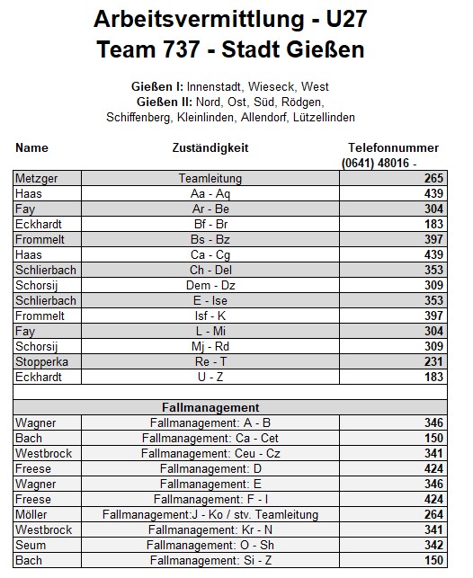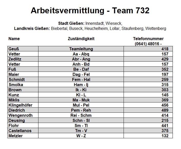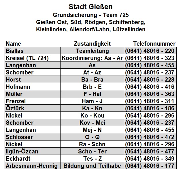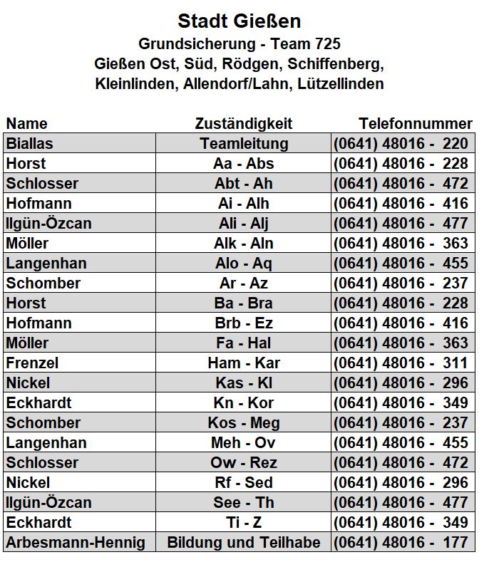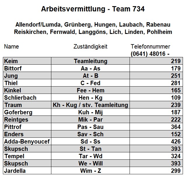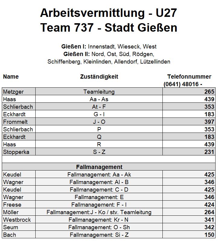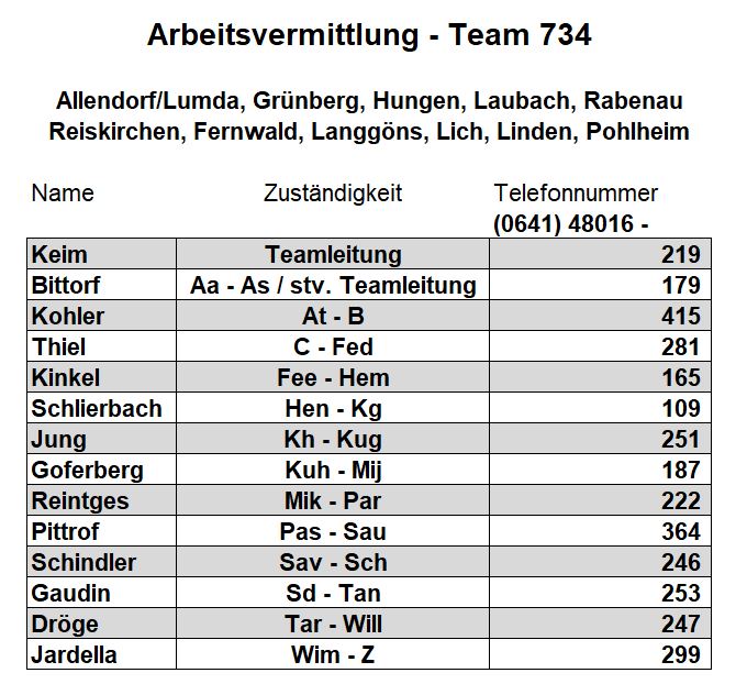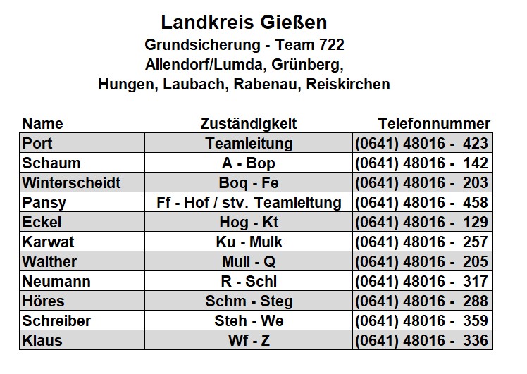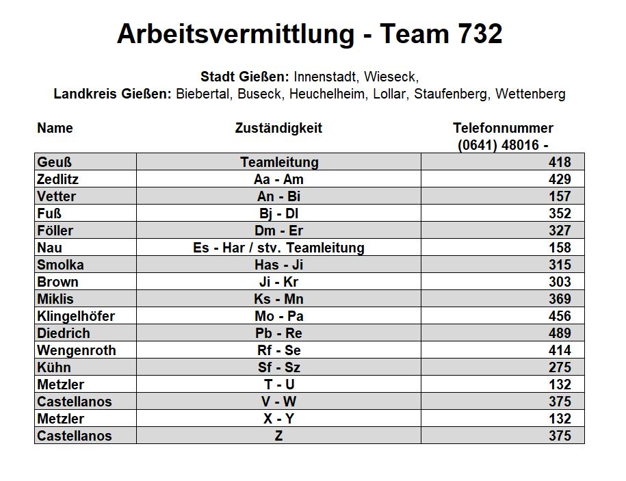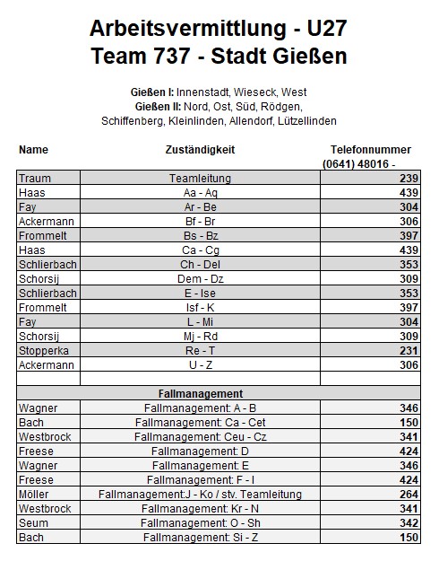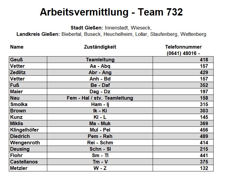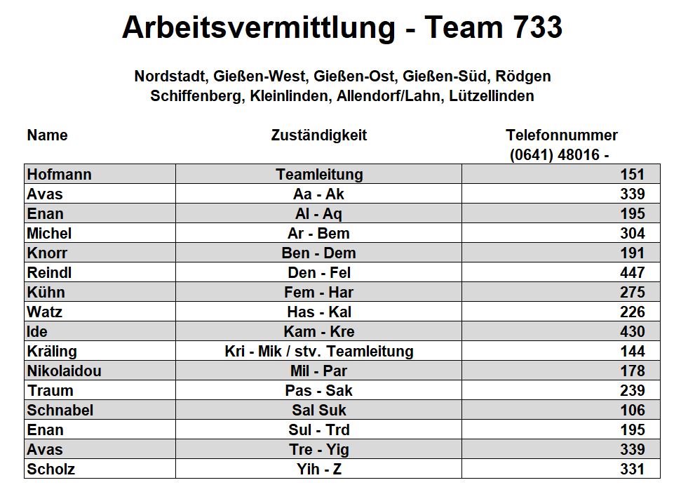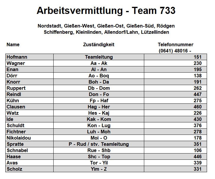 Als zusätzlichen Service haben wir Ihnen nachfolgend die Durchwahlnummern der für Sie zuständigen Ansprechpartner/innen in Arbeitsvermittlung und Grundsicherung im Jobcenter Gießen zusammengestellt. Da sich die Mitarbeiter/innen allerdings häufig in Gesprächen befinden, empfehlen wir Ihnen ausdrücklich, sich an unser Servicecenter zu wenden, da eine direkte Erreichbarkeit der zuständigen Fachkräfte nicht gewährleistet ist. Können unsere Telefonservicefachkräfte ausnahmsweise Ihr Anliegen nicht telefonisch klären, leiten sie es zur endgültigen Bearbeitung unverzüglich an die zuständige Fachabteilung weiter.