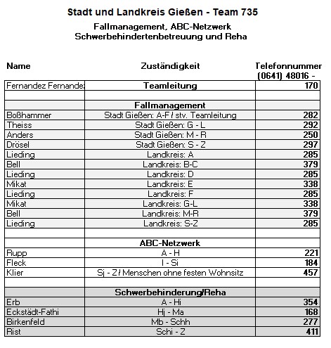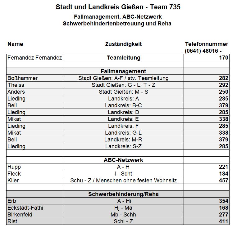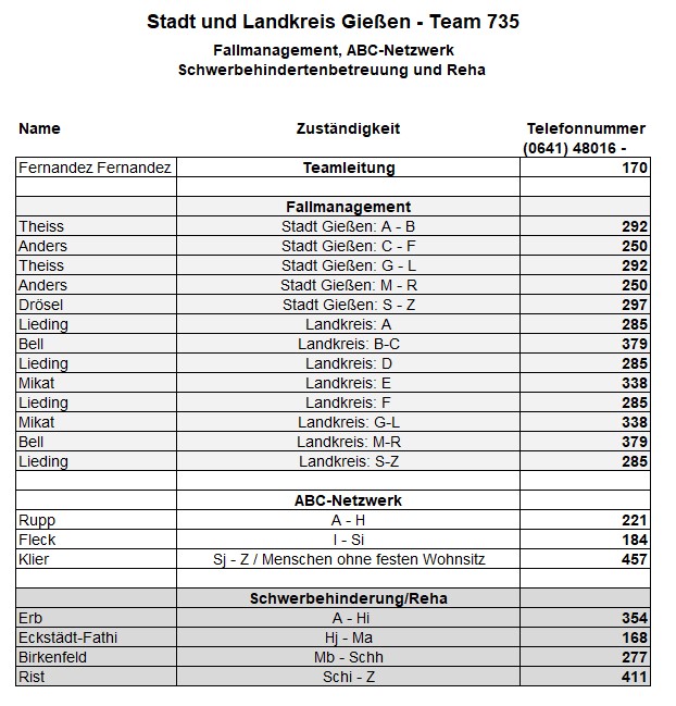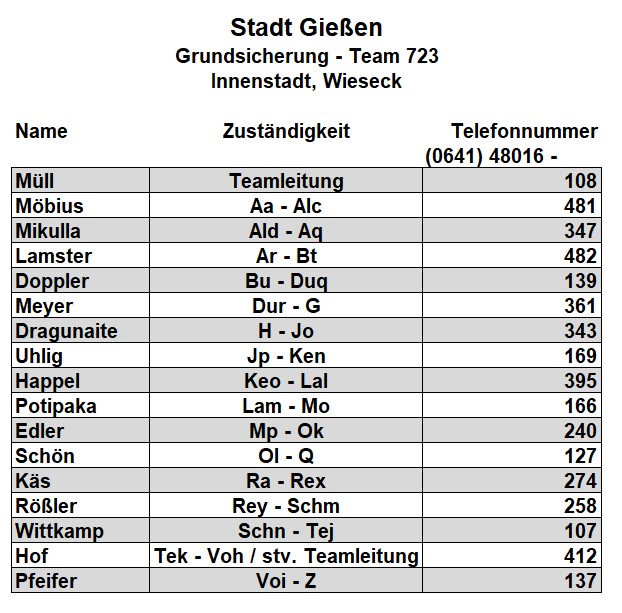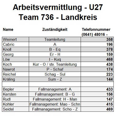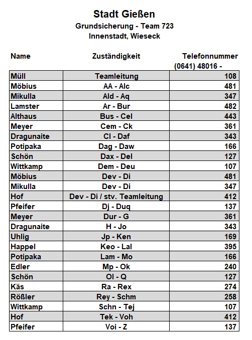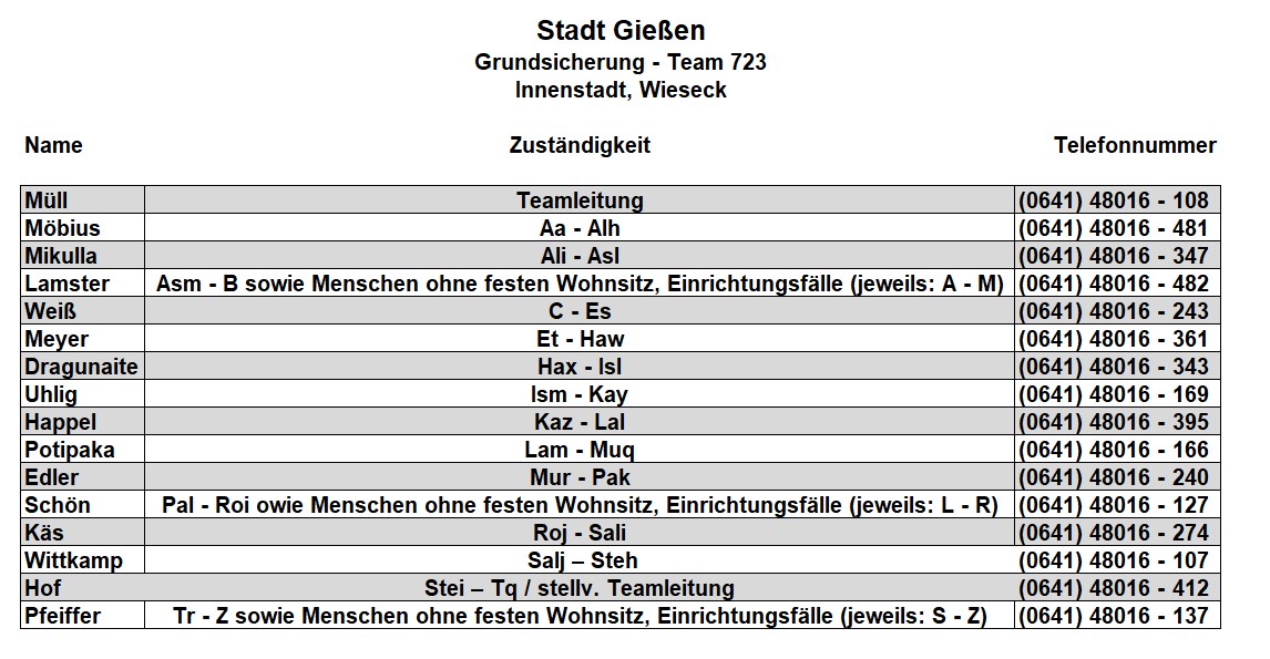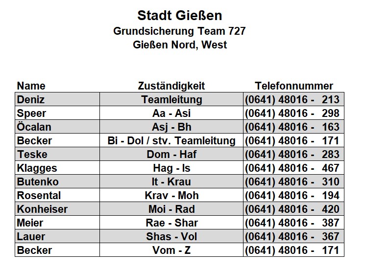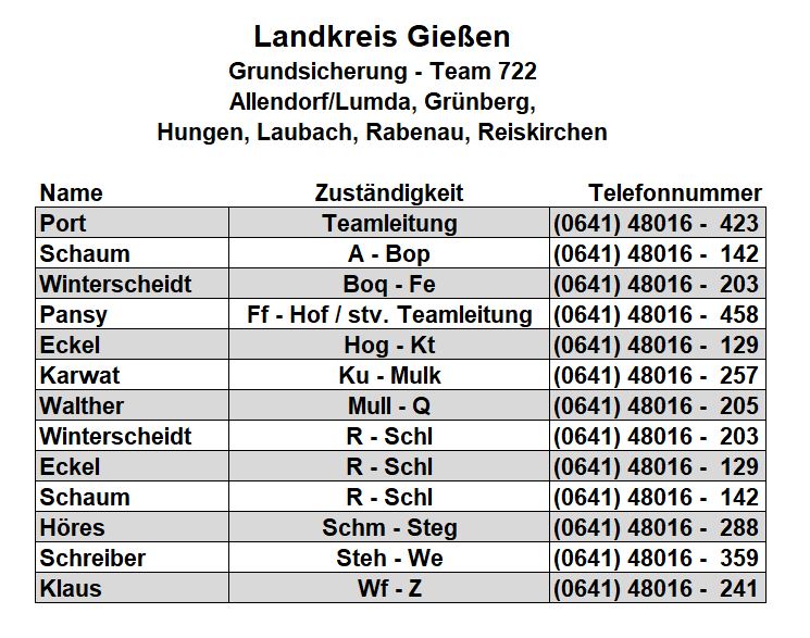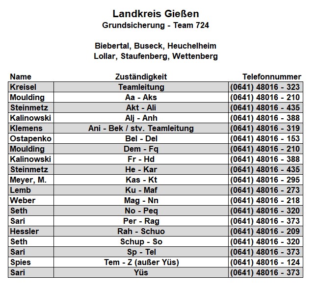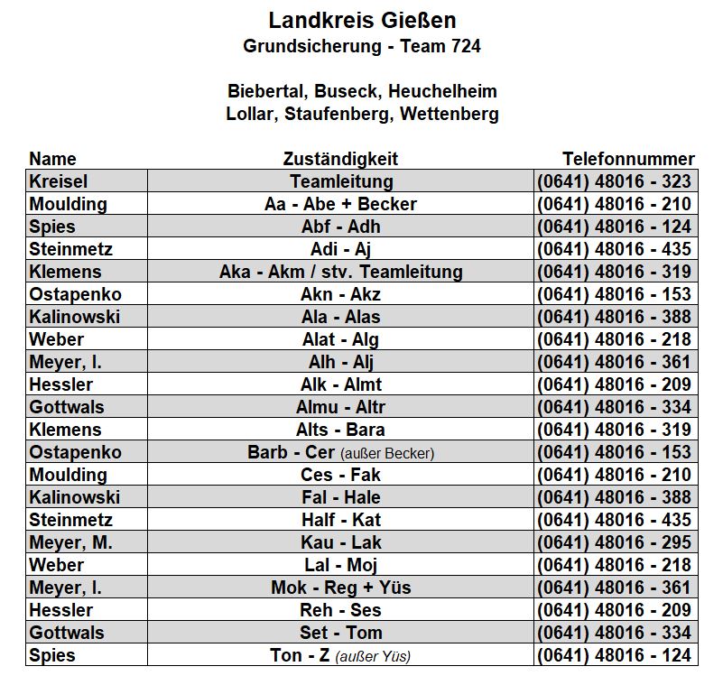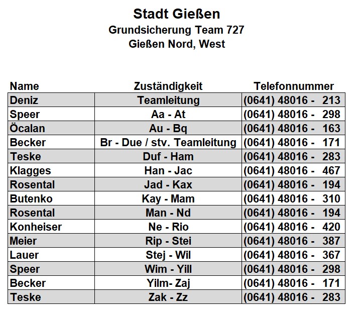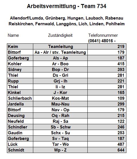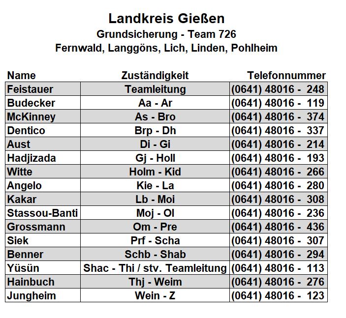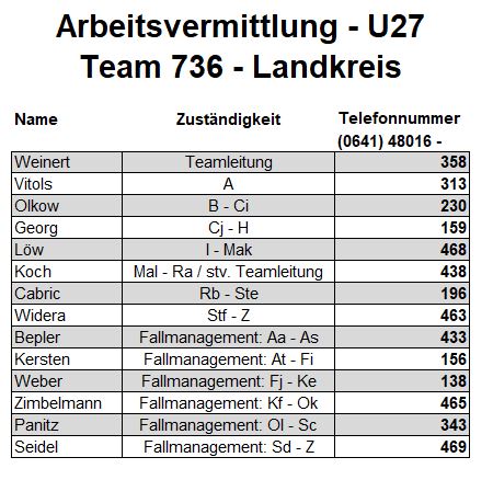Als zusätzlichen Service haben wir Ihnen nachfolgend die Durchwahlnummern der für Sie zuständigen Ansprechpartner/innen in Arbeitsvermittlung und Grundsicherung im Jobcenter Gießen zusammengestellt. Da sich die Mitarbeiter/innen allerdings häufig in Gesprächen befinden, empfehlen wir Ihnen ausdrücklich, sich an unser Servicecenter zu wenden, da eine direkte Erreichbarkeit der zuständigen Fachkräfte nicht gewährleistet ist. Können unsere Telefonservicefachkräfte ausnahmsweise Ihr Anliegen nicht telefonisch klären, leiten sie es zur endgültigen Bearbeitung unverzüglich an die zuständige Fachabteilung weiter.